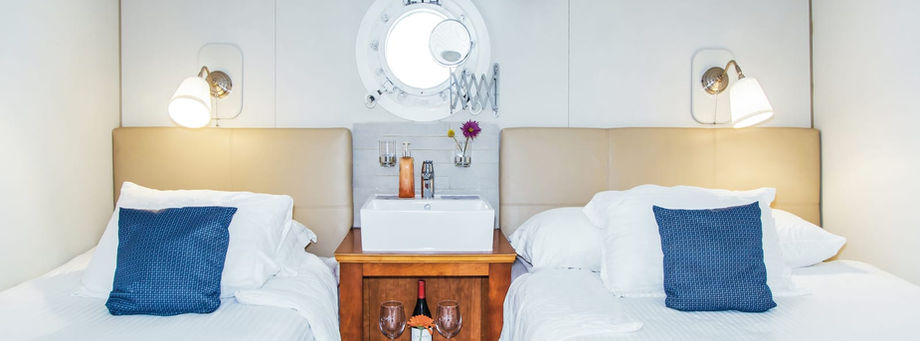 The lower deck has 8 comfortable cabins with various bed configurations (single and double occupancy). An affordable triple occupancy cabin is also available.